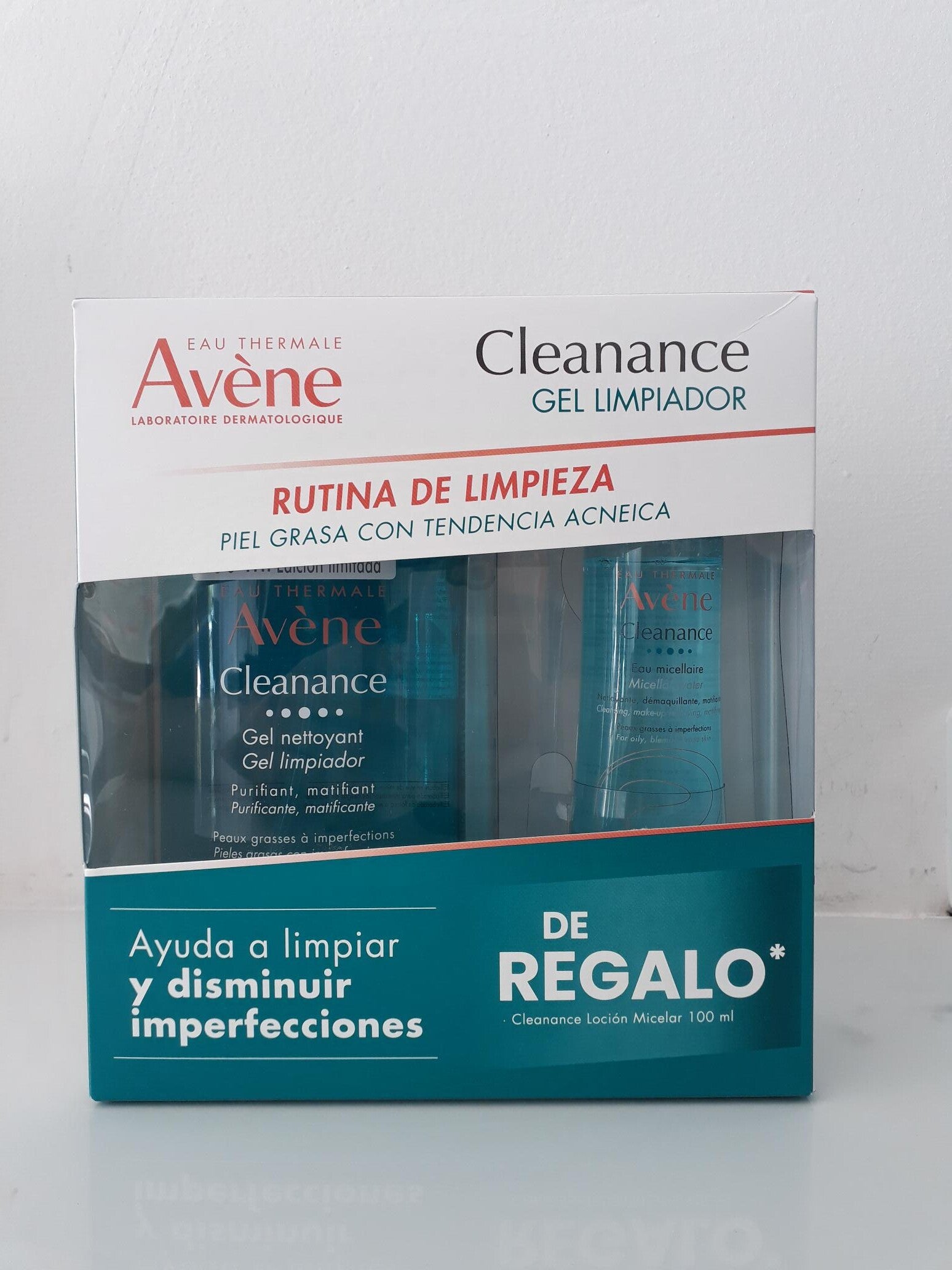 - Agua micelar Cleanance: Limpiador, desmaquillante, matificante.