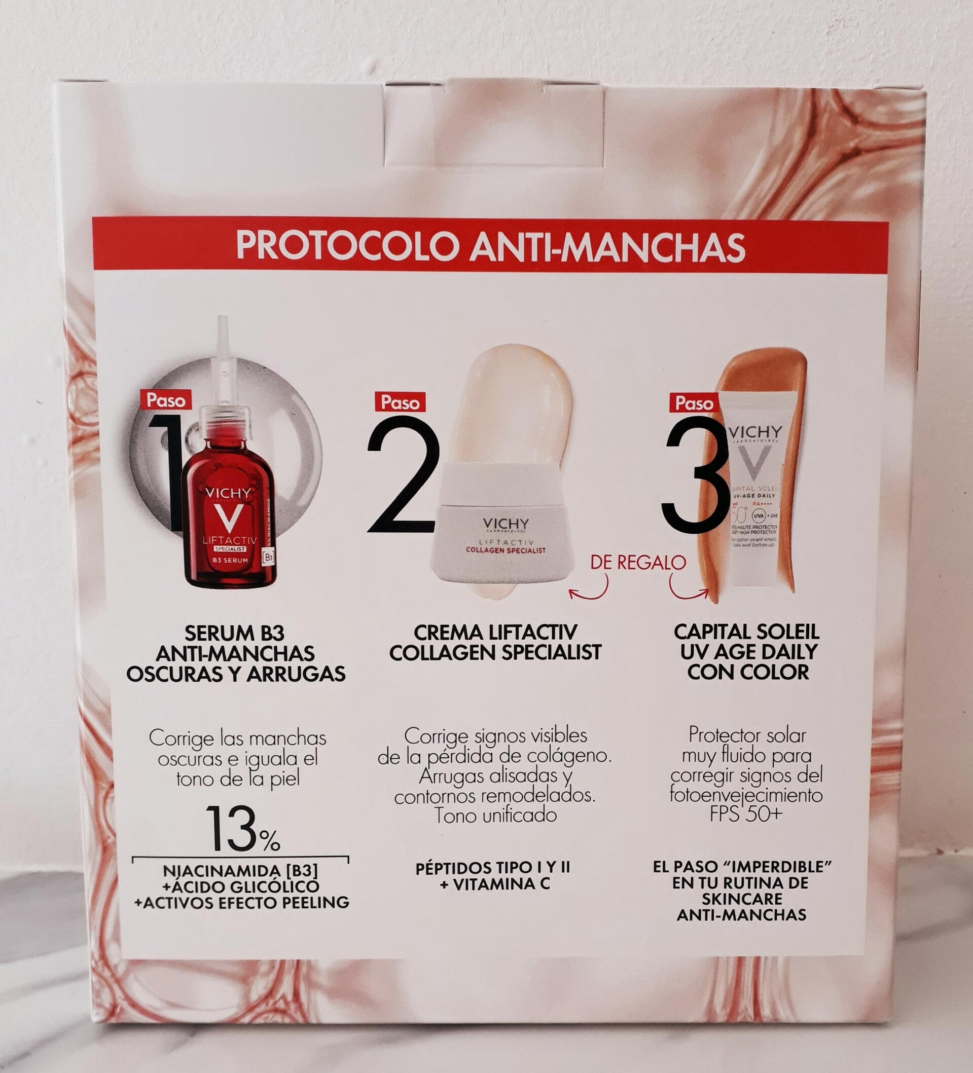 - CAPITAL SOLEIL UV AGE DAILY CON COLOR FPS 50+: Muy alta protección UVA, UVB y Luz Visible. Unifica el tono de la piel. Corrige los signos del foto-envejecimiento: manchas y pérdida de tonicidad. Probado dermatológicamente en pieles 100% sensibles.